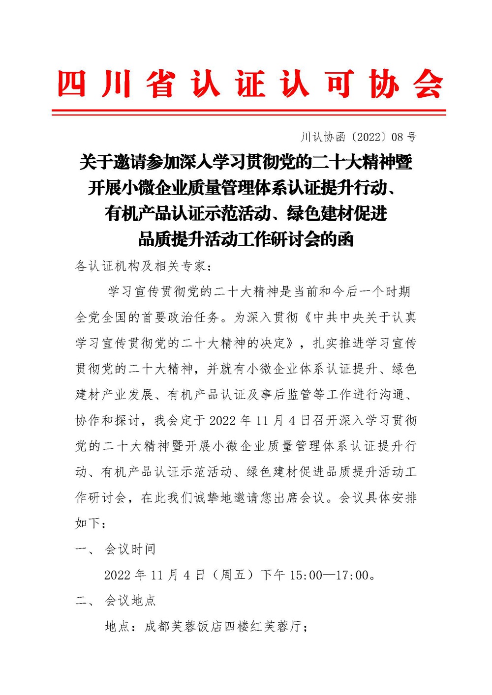 2022 年11 月4 日,四川省认证认可协会召开深入学习贯彻党的二十大精神暨开展小微企业质量管理体系认证提升行动、有机产品认证示范活动、绿色建材促进品质提升活动工作研讨会,华鉴国际认证有限公司受邀参加会议。