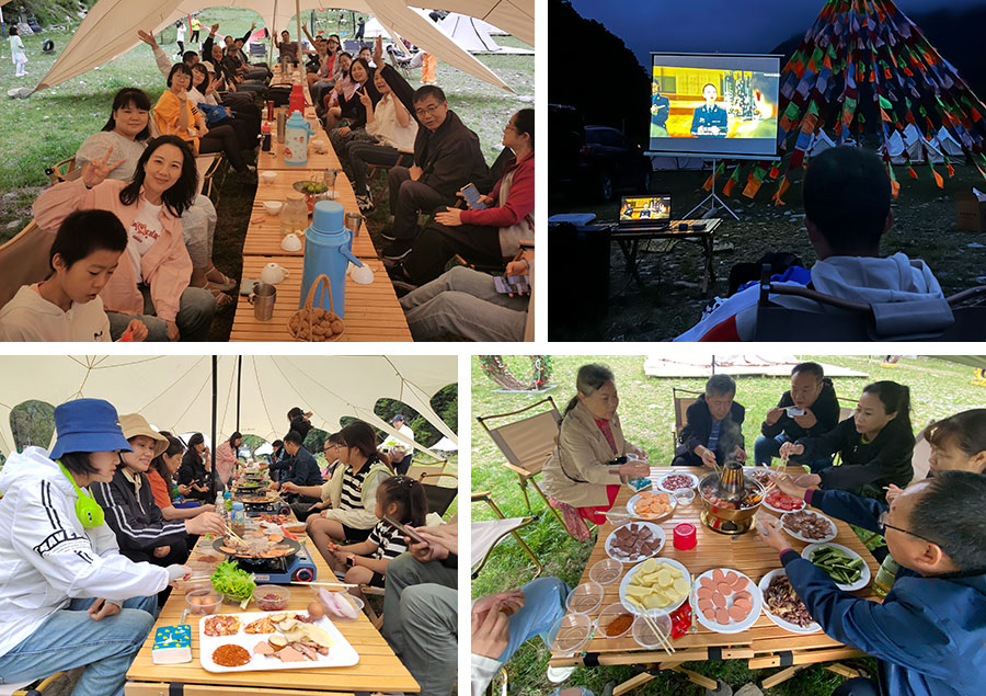 公司还为大家准备了精品下午茶,大家可以休闲喝茶/果饮,晚上安排了当地特色火锅、烤肉,晚饭后大家围坐在一起享受星空下的坝坝电影。
